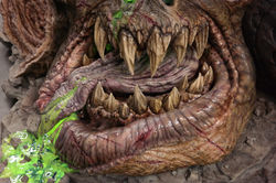 He is made of epoxy and silicone, with translucent urethane teeth. Green, glowing blood can be seen dripping off the tip of the ax and throughout the piece while a water vapor effect accentuates the green LED glow from the slain creature at the base. All of Groms armour and accessories were hand sculpted. His pants are hand tooled with real leather and his hair and stubble hand punched.